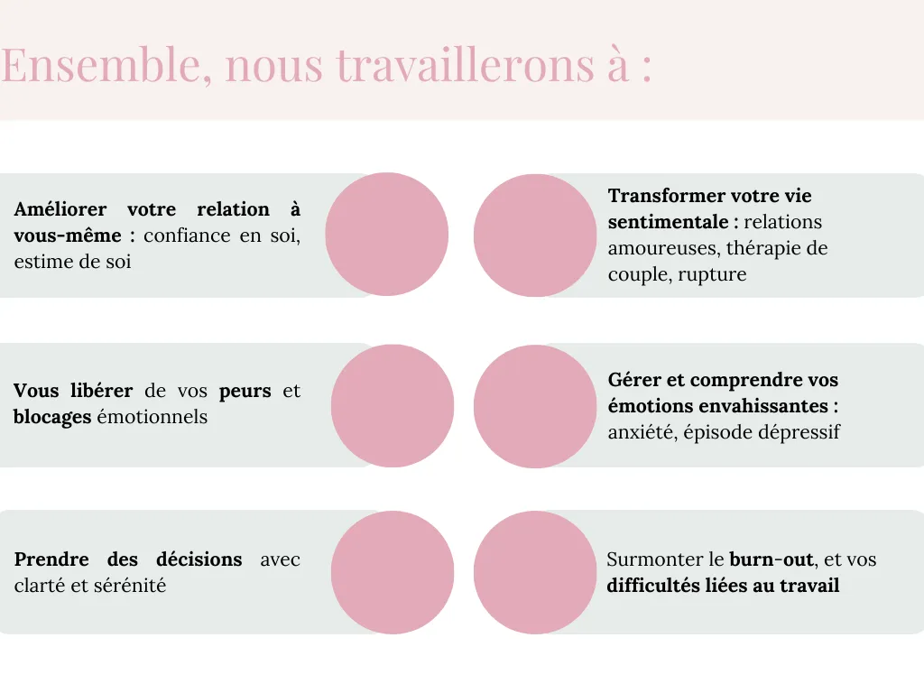 En fonction de votre histoire, de votre sensibilité, de ce que vous vivez, je peux combiner une approche thérapeutique (centrée sur l’émotionnel et le passé) et des outils issus du coaching (plus concrets et orientés action).