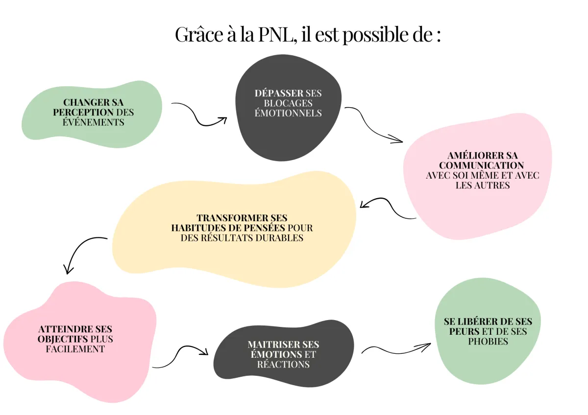 Elle explore comment nos pensées (neuro), notre langage (linguistique) et nos actions (programmation) interagissent et influencent notre manière de vivre et de réagir.